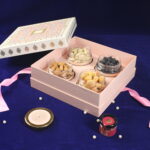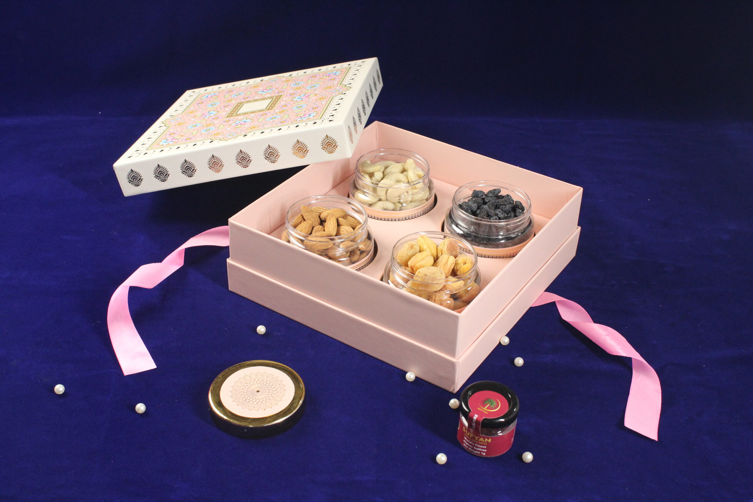 Stylish pastel box with dry fruits, ideal for elegant festive gifting.